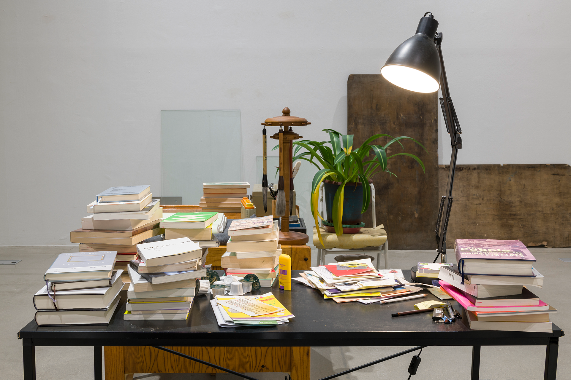2 desks, 3 chairs, one low slotted angle rack, books, papers, one stand lamp, oriental brushes, inkstone, ink stick, one plant, one painted sheet of plywood