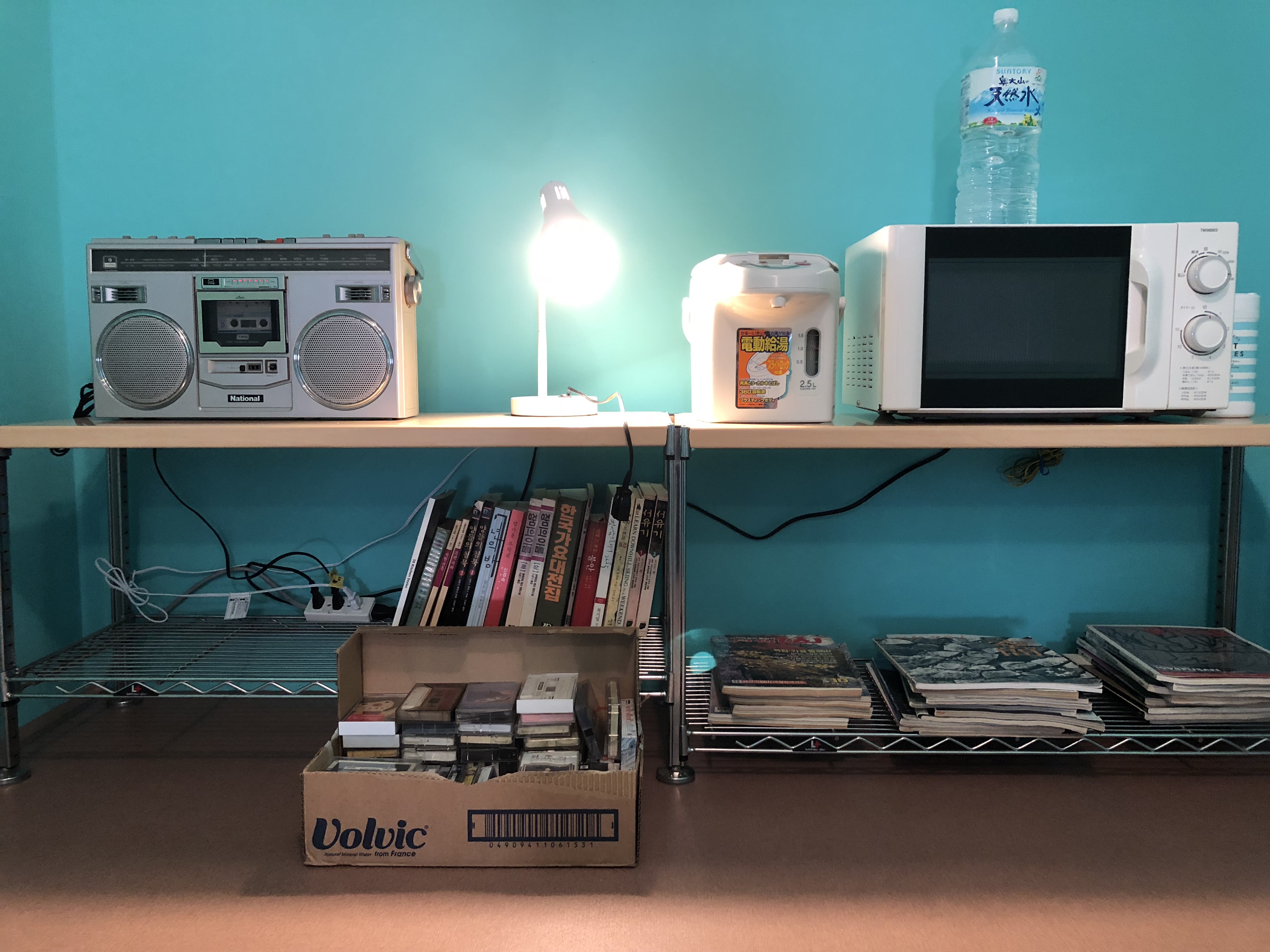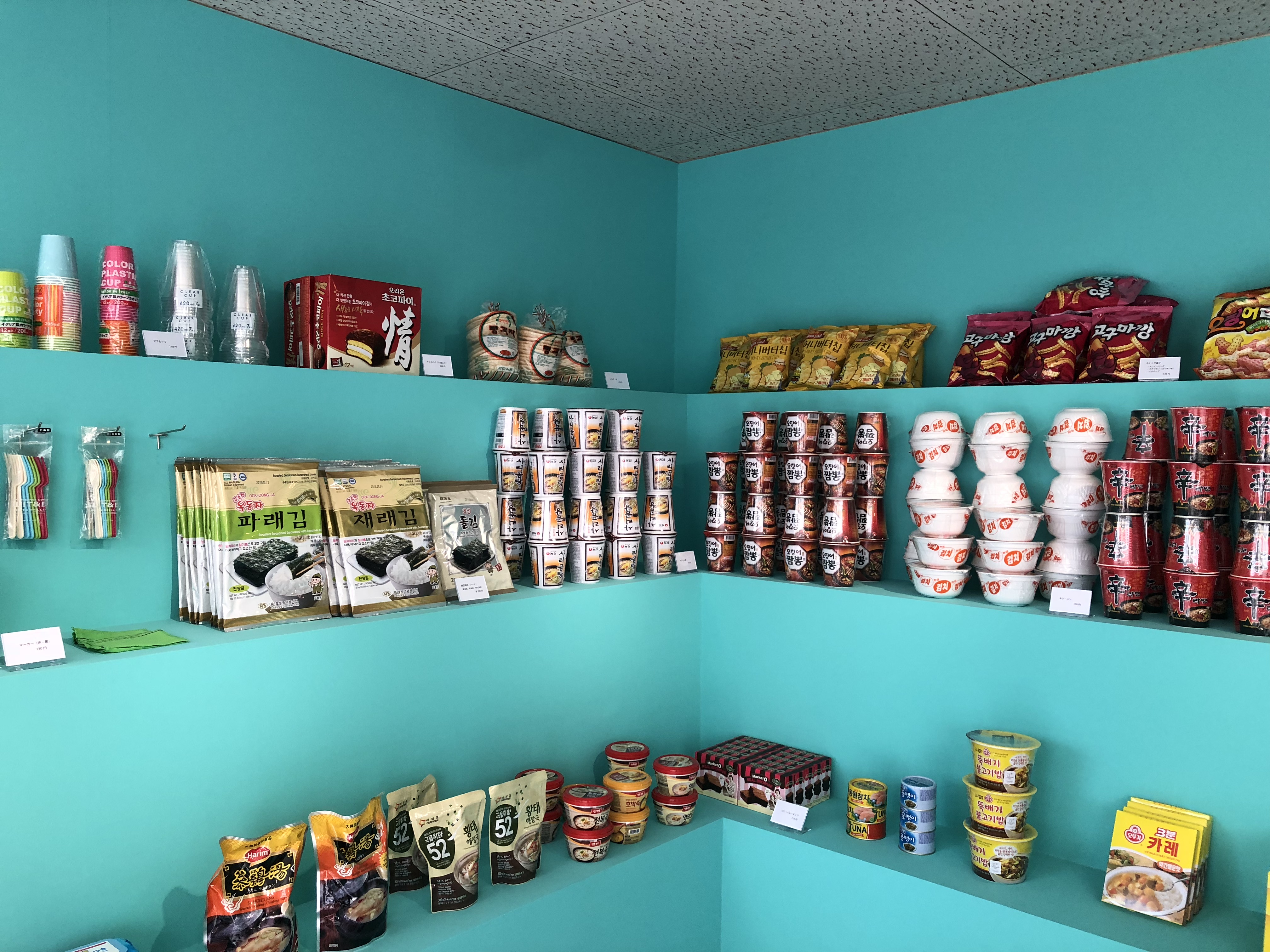 store sign, Korean ramens, Korean beers, Korean seaweeds, Korean canned foods, Korean chewing gums, Korean snacks, Korean chocolates, Korean dry squids, micro oven, tv, radio, one stand ramp, one chair, one trash can, one recycle bin and etc.
